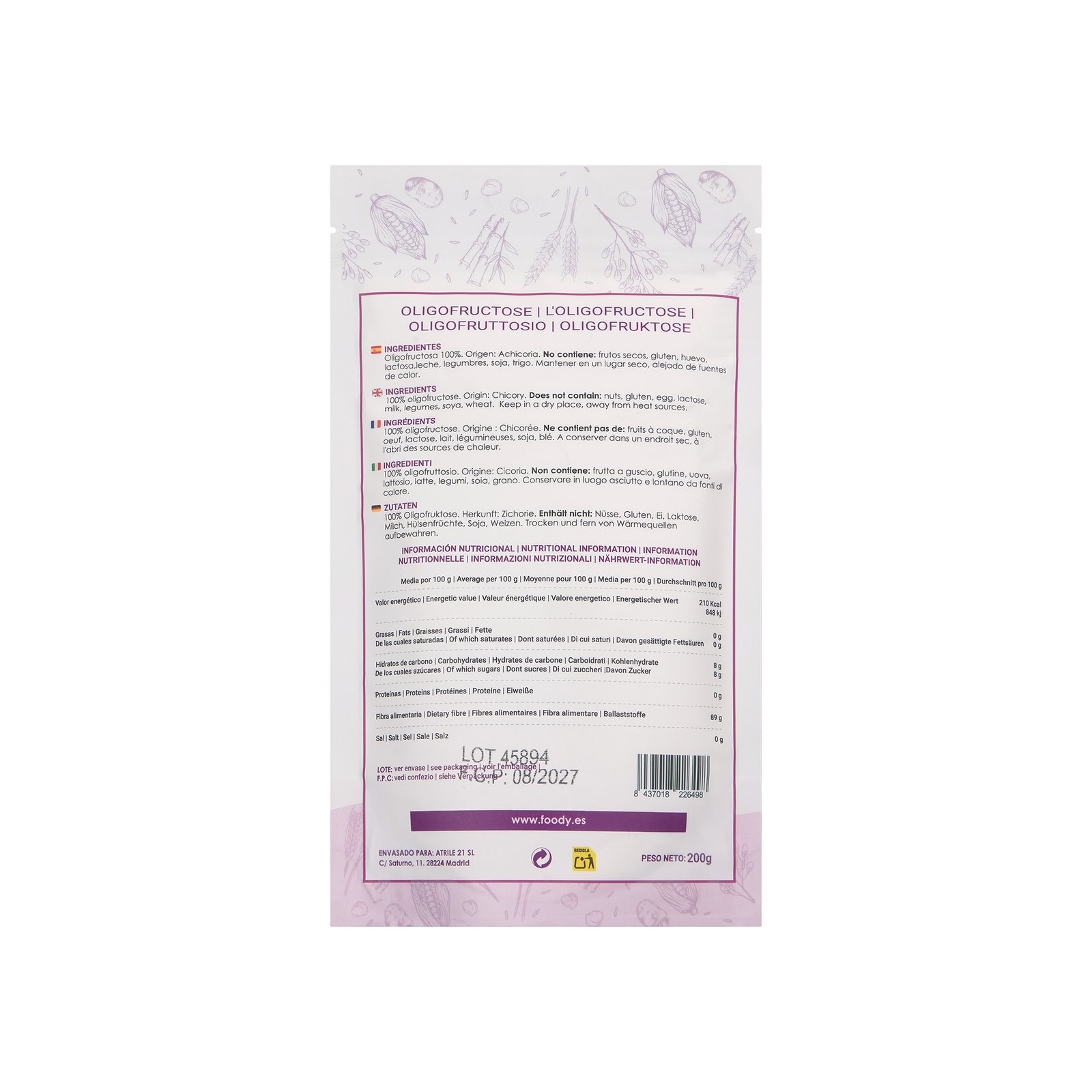 Ingredientes: 100% oligofructosa, procedente de la hidrólisis parcial de fibras de inulina de achicoria. La oligofructosa Moara se envasa en España y la materia prima tiene origen tanto en Bélgica como en Chile